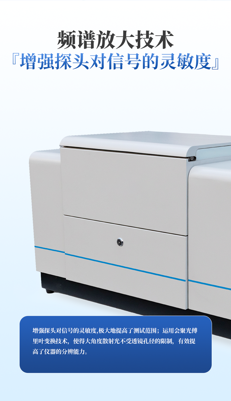 | 頻譜放大技術 | 增強探頭對信號的靈敏度,極大地提高了測試范圍;運用會聚光傅里葉變換技術,使得大角度散射光不受透鏡孔徑的限制,有效提高了儀器的分辨能力。 |