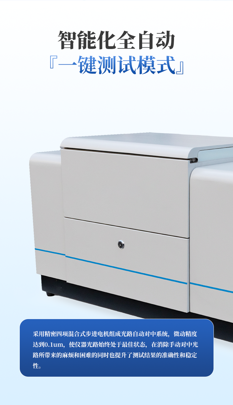 | 智能操作模式 | 具有智能化全自動操作模式,實現一鍵測試,即只要根據提示加入樣品,點擊“自動測試”,所有操作過程包括進水、分散、循環、測試、清洗、數據記錄、數據分析、保存及打印等全部自動完成,不僅減輕了測試人員的工作量,而且消除了人為因素的干擾誤差,進一步提高了測試的精度和結果的真實性。 |